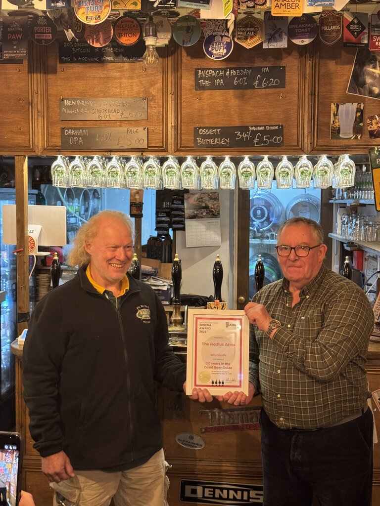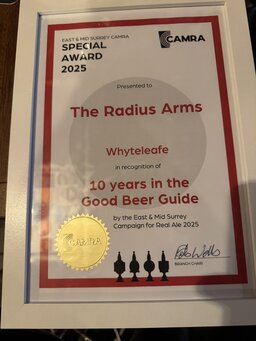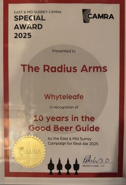 We’d like to congratulate The Radius Arms in Whyteleafe for their award for 10 consecutive years in CAMRA’s Good Beer Guide.